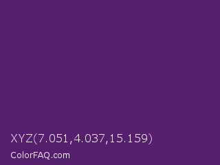 XYZ 7.051,4.037,15.159 Color is a dark purple color and the nearest color is Honey Flower #4f1c70. Hex code #551f6e and RGB value is rgb(85,31,110). In RGB color space, this color is composed of 33% red, 12% green, 43% blue, In CMYK color space, this color is composed of 23% cyan, 72% magenta, 0% yellow , 57% black , In HSL color space, this color has a hue angle of 281° , 56% saturation and 28% lightness.