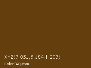 XYZ 7.051,6.184,1.203 Color is a very dark orange color and the nearest color is Pullman Brown UPS Brown #644117. Hex code #643e0d and RGB value is rgb(100,62,13). In RGB color space, this color is composed of 39% red, 24% green, 5% blue, In CMYK color space, this color is composed of 0% cyan, 38% magenta, 87% yellow , 61% black , In HSL color space, this color has a hue angle of 34° , 77% saturation and 22% lightness.