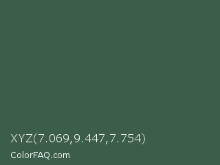 XYZ 7.069,9.447,7.754 Color is a dark green color and the nearest color is Mineral Green #3f5d53. Hex code #3c5e49 and RGB value is rgb(60,94,73). In RGB color space, this color is composed of 24% red, 37% green, 29% blue, In CMYK color space, this color is composed of 36% cyan, 0% magenta, 22% yellow , 63% black , In HSL color space, this color has a hue angle of 143° , 22% saturation and 30% lightness.
