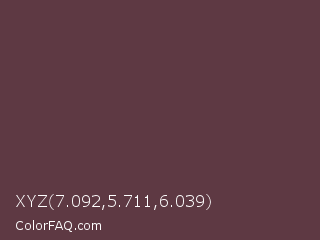 XYZ 7.092,5.711,6.039 Color is a dark rose color and the nearest color is Wine Dregs #673147. Hex code #5e3943 and RGB value is rgb(94,57,67). In RGB color space, this color is composed of 37% red, 22% green, 26% blue, In CMYK color space, this color is composed of 0% cyan, 39% magenta, 29% yellow , 63% black , In HSL color space, this color has a hue angle of 344° , 25% saturation and 30% lightness.