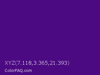 XYZ 7.118,3.365,21.393 Color is a dark purple color and the nearest color is Pigment Indigo #4b0082. Hex code #4c0a82 and RGB value is rgb(76,10,130). In RGB color space, this color is composed of 30% red, 4% green, 51% blue, In CMYK color space, this color is composed of 42% cyan, 92% magenta, 0% yellow , 49% black , In HSL color space, this color has a hue angle of 273° , 86% saturation and 27% lightness.