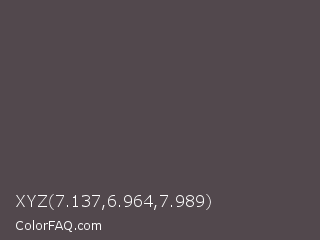 XYZ 7.137,6.964,7.989 Color is a dark rose color and the nearest color is Quartz #51484f. Hex code #52484d and RGB value is rgb(82,72,77). In RGB color space, this color is composed of 32% red, 28% green, 30% blue, In CMYK color space, this color is composed of 0% cyan, 12% magenta, 6% yellow , 68% black , In HSL color space, this color has a hue angle of 330° , 6% saturation and 30% lightness.