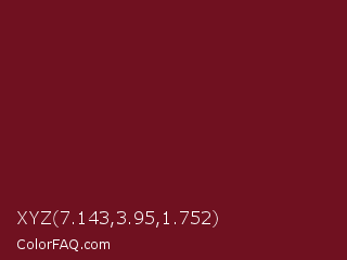 XYZ 7.143,3.95,1.752 Color is a dark red color and the nearest color is Persian Plum #701c1c. Hex code #701120 and RGB value is rgb(112,17,32). In RGB color space, this color is composed of 44% red, 7% green, 13% blue, In CMYK color space, this color is composed of 0% cyan, 85% magenta, 71% yellow , 56% black , In HSL color space, this color has a hue angle of 351° , 74% saturation and 25% lightness.