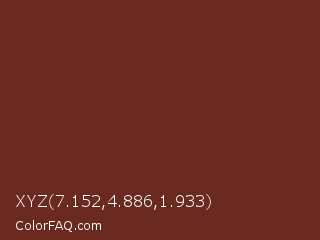 XYZ 7.152,4.886,1.933 Color is a dark red color and the nearest color is Liver Organ #6c2e1f. Hex code #6b2a20 and RGB value is rgb(107,42,32). In RGB color space, this color is composed of 42% red, 16% green, 13% blue, In CMYK color space, this color is composed of 0% cyan, 61% magenta, 70% yellow , 58% black , In HSL color space, this color has a hue angle of 8° , 54% saturation and 27% lightness.