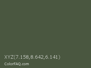 XYZ 7.158,8.642,6.141 Color is a dark green color and the nearest color is Gray Asparagus #465945. Hex code #4a5740 and RGB value is rgb(74,87,64). In RGB color space, this color is composed of 29% red, 34% green, 25% blue, In CMYK color space, this color is composed of 15% cyan, 0% magenta, 26% yellow , 66% black , In HSL color space, this color has a hue angle of 94° , 15% saturation and 30% lightness.