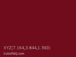 XYZ 7.164,3.844,1.593 Color is a dark red color and the nearest color is UP Maroon #7b1113. Hex code #710b1e and RGB value is rgb(113,11,30). In RGB color space, this color is composed of 44% red, 4% green, 12% blue, In CMYK color space, this color is composed of 0% cyan, 90% magenta, 73% yellow , 56% black , In HSL color space, this color has a hue angle of 349° , 82% saturation and 24% lightness.