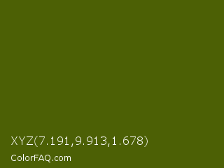 XYZ 7.191,9.913,1.678 Color is a very dark lime color and the nearest color is Verdun Green #495400. Hex code #4c6005 and RGB value is rgb(76,96,5). In RGB color space, this color is composed of 30% red, 38% green, 2% blue, In CMYK color space, this color is composed of 21% cyan, 0% magenta, 95% yellow , 62% black , In HSL color space, this color has a hue angle of 73° , 90% saturation and 20% lightness.