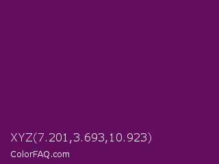 XYZ 7.201,3.693,10.923 Color is a very dark magenta color and the nearest color is Palatinate Purple #682860. Hex code #620d5e and RGB value is rgb(98,13,94). In RGB color space, this color is composed of 38% red, 5% green, 37% blue, In CMYK color space, this color is composed of 0% cyan, 87% magenta, 4% yellow , 62% black , In HSL color space, this color has a hue angle of 303° , 77% saturation and 22% lightness.