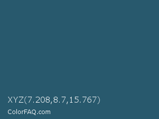 XYZ 7.208,8.7,15.767 Color is a dark blue color and the nearest color is Casal #2f6168. Hex code #28596d and RGB value is rgb(40,89,109). In RGB color space, this color is composed of 16% red, 35% green, 43% blue, In CMYK color space, this color is composed of 63% cyan, 18% magenta, 0% yellow , 57% black , In HSL color space, this color has a hue angle of 197° , 46% saturation and 29% lightness.