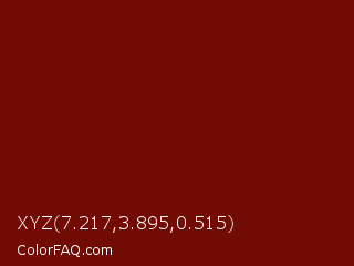 XYZ 7.217,3.895,0.515 Color is a dark red color and the nearest color is Dark Burgundy #770f05. Hex code #730b05 and RGB value is rgb(115,11,5). In RGB color space, this color is composed of 45% red, 4% green, 2% blue, In CMYK color space, this color is composed of 0% cyan, 90% magenta, 96% yellow , 55% black , In HSL color space, this color has a hue angle of 3° , 92% saturation and 24% lightness.