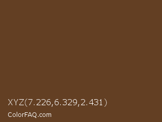 XYZ 7.226,6.329,2.431 Color is a dark orange color and the nearest color is Otter Brown #654321. Hex code #633f23 and RGB value is rgb(99,63,35). In RGB color space, this color is composed of 39% red, 25% green, 14% blue, In CMYK color space, this color is composed of 0% cyan, 36% magenta, 65% yellow , 61% black , In HSL color space, this color has a hue angle of 26° , 48% saturation and 26% lightness.