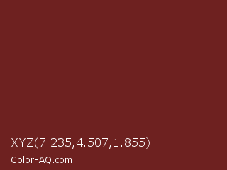 XYZ 7.235,4.507,1.855 Color is a dark red color and the nearest color is Persian Plum #701c1c. Hex code #6e2120 and RGB value is rgb(110,33,32). In RGB color space, this color is composed of 43% red, 13% green, 13% blue, In CMYK color space, this color is composed of 0% cyan, 70% magenta, 71% yellow , 57% black , In HSL color space, this color has a hue angle of 1° , 55% saturation and 28% lightness.