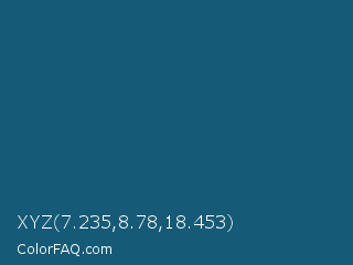 XYZ 7.235,8.78,18.453 Color is a dark blue color and the nearest color is Blumine #18587a. Hex code #155a76 and RGB value is rgb(21,90,118). In RGB color space, this color is composed of 8% red, 35% green, 46% blue, In CMYK color space, this color is composed of 82% cyan, 24% magenta, 0% yellow , 54% black , In HSL color space, this color has a hue angle of 197° , 70% saturation and 27% lightness.