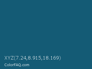 XYZ 7.24,8.915,18.169 Color is a dark blue color and the nearest color is Blumine #18587a. Hex code #145b75 and RGB value is rgb(20,91,117). In RGB color space, this color is composed of 8% red, 36% green, 46% blue, In CMYK color space, this color is composed of 83% cyan, 22% magenta, 0% yellow , 54% black , In HSL color space, this color has a hue angle of 196° , 71% saturation and 27% lightness.
