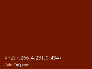 XYZ 7.266,4.231,0.434 Color is a very dark red color and the nearest color is Cedar Wood Finish #711a00. Hex code #721800 and RGB value is rgb(114,24,0). In RGB color space, this color is composed of 45% red, 9% green, 0% blue, In CMYK color space, this color is composed of 0% cyan, 79% magenta, 100% yellow , 55% black , In HSL color space, this color has a hue angle of 13° , 100% saturation and 22% lightness.
