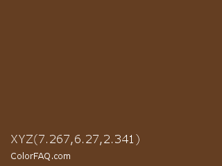 XYZ 7.267,6.27,2.341 Color is a dark orange color and the nearest color is Otter Brown #654321. Hex code #643e22 and RGB value is rgb(100,62,34). In RGB color space, this color is composed of 39% red, 24% green, 13% blue, In CMYK color space, this color is composed of 0% cyan, 38% magenta, 66% yellow , 61% black , In HSL color space, this color has a hue angle of 25° , 49% saturation and 26% lightness.