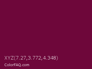 XYZ 7.27,3.772,4.348 Color is a dark rose color and the nearest color is Tyrian Purple #66023c. Hex code #6e073a and RGB value is rgb(110,7,58). In RGB color space, this color is composed of 43% red, 3% green, 23% blue, In CMYK color space, this color is composed of 0% cyan, 94% magenta, 47% yellow , 57% black , In HSL color space, this color has a hue angle of 330° , 88% saturation and 23% lightness.