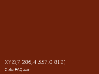 XYZ 7.286,4.557,0.812 Color is a dark red color and the nearest color is Moccaccino #6e1d14. Hex code #70210b and RGB value is rgb(112,33,11). In RGB color space, this color is composed of 44% red, 13% green, 4% blue, In CMYK color space, this color is composed of 0% cyan, 71% magenta, 90% yellow , 56% black , In HSL color space, this color has a hue angle of 13° , 82% saturation and 24% lightness.