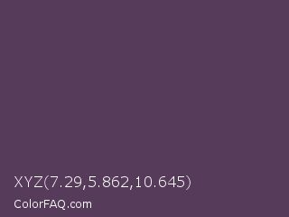 XYZ 7.29,5.862,10.645 Color is a dark purple color and the nearest color is English Violet #563c5c. Hex code #563b5b and RGB value is rgb(86,59,91). In RGB color space, this color is composed of 34% red, 23% green, 36% blue, In CMYK color space, this color is composed of 5% cyan, 35% magenta, 0% yellow , 64% black , In HSL color space, this color has a hue angle of 291° , 21% saturation and 29% lightness.