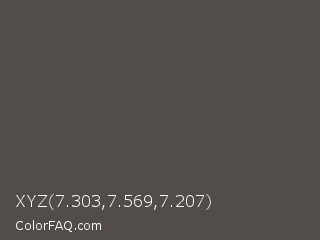 XYZ 7.303,7.569,7.207 Color is a dark orange color and the nearest color is Emperor #514649. Hex code #524d48 and RGB value is rgb(82,77,72). In RGB color space, this color is composed of 32% red, 30% green, 28% blue, In CMYK color space, this color is composed of 0% cyan, 6% magenta, 12% yellow , 68% black , In HSL color space, this color has a hue angle of 30° , 6% saturation and 30% lightness.