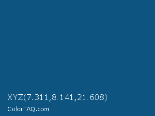 XYZ 7.311,8.141,21.608 Color is a dark blue color and the nearest color is Chathams Blue #175579. Hex code #0d5580 and RGB value is rgb(13,85,128). In RGB color space, this color is composed of 5% red, 33% green, 50% blue, In CMYK color space, this color is composed of 90% cyan, 34% magenta, 0% yellow , 50% black , In HSL color space, this color has a hue angle of 202° , 82% saturation and 28% lightness.