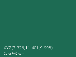 XYZ 7.326,11.401,9.998 Color is a dark green color and the nearest color is Dark Spring Green #177245. Hex code #1d6b53 and RGB value is rgb(29,107,83). In RGB color space, this color is composed of 11% red, 42% green, 33% blue, In CMYK color space, this color is composed of 73% cyan, 0% magenta, 22% yellow , 58% black , In HSL color space, this color has a hue angle of 162° , 57% saturation and 27% lightness.