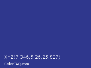 XYZ 7.346,5.26,25.827 Color is a normal blue color and the nearest color is Cosmic Cobalt #2e2d88. Hex code #2f378d and RGB value is rgb(47,55,141). In RGB color space, this color is composed of 18% red, 22% green, 55% blue, In CMYK color space, this color is composed of 67% cyan, 61% magenta, 0% yellow , 45% black , In HSL color space, this color has a hue angle of 235° , 50% saturation and 37% lightness.