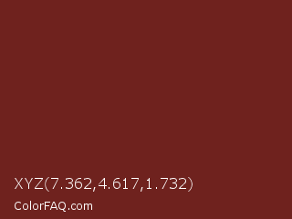 XYZ 7.362,4.617,1.732 Color is a dark red color and the nearest color is Persian Plum #701c1c. Hex code #6f221e and RGB value is rgb(111,34,30). In RGB color space, this color is composed of 44% red, 13% green, 12% blue, In CMYK color space, this color is composed of 0% cyan, 69% magenta, 73% yellow , 56% black , In HSL color space, this color has a hue angle of 3° , 57% saturation and 28% lightness.
