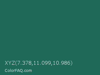 XYZ 7.378,11.099,10.986 Color is a dark cyan color and the nearest color is Spectra #2f5a57. Hex code #1f6958 and RGB value is rgb(31,105,88). In RGB color space, this color is composed of 12% red, 41% green, 35% blue, In CMYK color space, this color is composed of 70% cyan, 0% magenta, 16% yellow , 59% black , In HSL color space, this color has a hue angle of 166° , 54% saturation and 27% lightness.