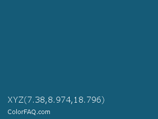 XYZ 7.38,8.974,18.796 Color is a dark blue color and the nearest color is Blumine #18587a. Hex code #155b77 and RGB value is rgb(21,91,119). In RGB color space, this color is composed of 8% red, 36% green, 47% blue, In CMYK color space, this color is composed of 82% cyan, 24% magenta, 0% yellow , 53% black , In HSL color space, this color has a hue angle of 197° , 70% saturation and 27% lightness.