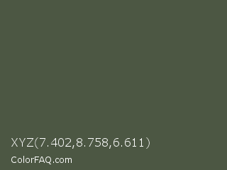 XYZ 7.402,8.758,6.611 Color is a dark green color and the nearest color is Gray Asparagus #465945. Hex code #4c5743 and RGB value is rgb(76,87,67). In RGB color space, this color is composed of 30% red, 34% green, 26% blue, In CMYK color space, this color is composed of 13% cyan, 0% magenta, 23% yellow , 66% black , In HSL color space, this color has a hue angle of 93° , 13% saturation and 30% lightness.