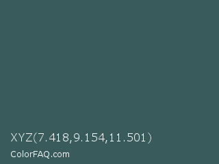 XYZ 7.418,9.154,11.501 Color is a dark cyan color and the nearest color is Mineral Green #3f5d53. Hex code #3a5b5c and RGB value is rgb(58,91,92). In RGB color space, this color is composed of 23% red, 36% green, 36% blue, In CMYK color space, this color is composed of 37% cyan, 1% magenta, 0% yellow , 64% black , In HSL color space, this color has a hue angle of 182° , 23% saturation and 29% lightness.