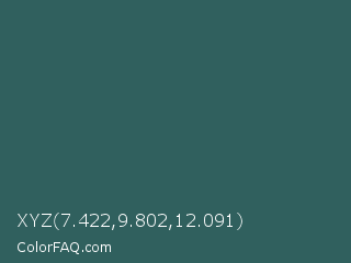 XYZ 7.422,9.802,12.091 Color is a dark cyan color and the nearest color is Spectra #2f5a57. Hex code #30605e and RGB value is rgb(48,96,94). In RGB color space, this color is composed of 19% red, 38% green, 37% blue, In CMYK color space, this color is composed of 50% cyan, 0% magenta, 2% yellow , 62% black , In HSL color space, this color has a hue angle of 178° , 33% saturation and 28% lightness.