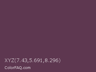 XYZ 7.43,5.691,8.296 Color is a dark magenta color and the nearest color is Dark Byzantium #5d3954. Hex code #5e3750 and RGB value is rgb(94,55,80). In RGB color space, this color is composed of 37% red, 22% green, 31% blue, In CMYK color space, this color is composed of 0% cyan, 41% magenta, 15% yellow , 63% black , In HSL color space, this color has a hue angle of 322° , 26% saturation and 29% lightness.