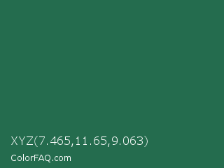 XYZ 7.465,11.65,9.063 Color is a dark green color and the nearest color is Dark Spring Green #177245. Hex code #246c4e and RGB value is rgb(36,108,78). In RGB color space, this color is composed of 14% red, 42% green, 31% blue, In CMYK color space, this color is composed of 67% cyan, 0% magenta, 28% yellow , 58% black , In HSL color space, this color has a hue angle of 155° , 50% saturation and 28% lightness.