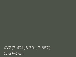 XYZ 7.471,8.301,7.687 Color is a normal green color and the nearest color is Fuscous Gray #54534d. Hex code #4e534a and RGB value is rgb(78,83,74). In RGB color space, this color is composed of 31% red, 33% green, 29% blue, In CMYK color space, this color is composed of 6% cyan, 0% magenta, 11% yellow , 67% black , In HSL color space, this color has a hue angle of 93° , 6% saturation and 31% lightness.