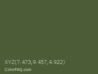 XYZ 7.473,9.457,4.922 Color is a dark green color and the nearest color is Tom Thumb #3f583b. Hex code #4c5c36 and RGB value is rgb(76,92,54). In RGB color space, this color is composed of 30% red, 36% green, 21% blue, In CMYK color space, this color is composed of 17% cyan, 0% magenta, 41% yellow , 64% black , In HSL color space, this color has a hue angle of 85° , 26% saturation and 29% lightness.