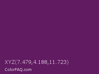 XYZ 7.479,4.188,11.723 Color is a dark magenta color and the nearest color is Palatinate Purple #682860. Hex code #611b61 and RGB value is rgb(97,27,97). In RGB color space, this color is composed of 38% red, 11% green, 38% blue, In CMYK color space, this color is composed of 0% cyan, 72% magenta, 0% yellow , 62% black , In HSL color space, this color has a hue angle of 300° , 56% saturation and 24% lightness.