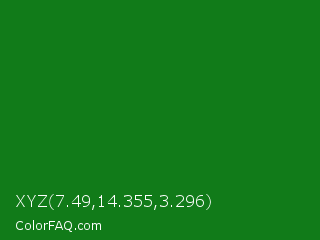 XYZ 7.49,14.355,3.296 Color is a dark green color and the nearest color is India Green #138808. Hex code #117b19 and RGB value is rgb(17,123,25). In RGB color space, this color is composed of 7% red, 48% green, 10% blue, In CMYK color space, this color is composed of 86% cyan, 0% magenta, 80% yellow , 52% black , In HSL color space, this color has a hue angle of 125° , 76% saturation and 27% lightness.