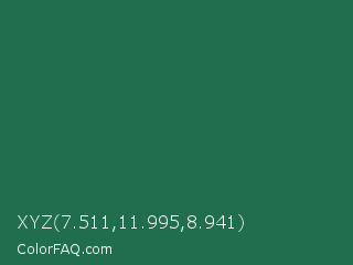XYZ 7.511,11.995,8.941 Color is a dark green color and the nearest color is Dark Spring Green #177245. Hex code #206e4d and RGB value is rgb(32,110,77). In RGB color space, this color is composed of 13% red, 43% green, 30% blue, In CMYK color space, this color is composed of 71% cyan, 0% magenta, 30% yellow , 57% black , In HSL color space, this color has a hue angle of 155° , 55% saturation and 28% lightness.