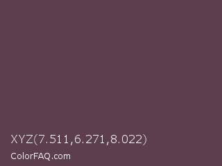 XYZ 7.511,6.271,8.022 Color is a dark rose color and the nearest color is Eggplant #614051. Hex code #5c3e4e and RGB value is rgb(92,62,78). In RGB color space, this color is composed of 36% red, 24% green, 31% blue, In CMYK color space, this color is composed of 0% cyan, 33% magenta, 15% yellow , 64% black , In HSL color space, this color has a hue angle of 328° , 19% saturation and 30% lightness.