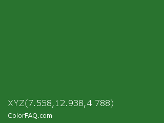 XYZ 7.558,12.938,4.788 Color is a normal green color and the nearest color is Mughal Green #306030. Hex code #29732f and RGB value is rgb(41,115,47). In RGB color space, this color is composed of 16% red, 45% green, 18% blue, In CMYK color space, this color is composed of 64% cyan, 0% magenta, 59% yellow , 55% black , In HSL color space, this color has a hue angle of 125° , 47% saturation and 31% lightness.
