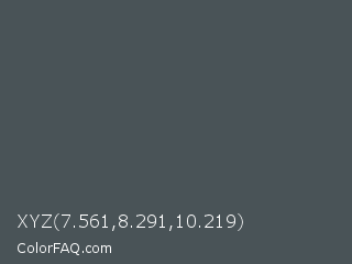 XYZ 7.561,8.291,10.219 Color is a normal blue color and the nearest color is Abbey #4c4f56. Hex code #495357 and RGB value is rgb(73,83,87). In RGB color space, this color is composed of 29% red, 33% green, 34% blue, In CMYK color space, this color is composed of 16% cyan, 5% magenta, 0% yellow , 66% black , In HSL color space, this color has a hue angle of 197° , 9% saturation and 31% lightness.