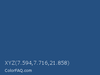 XYZ 7.594,7.716,21.858 Color is a normal blue color and the nearest color is Blumine #18587a. Hex code #255081 and RGB value is rgb(37,80,129). In RGB color space, this color is composed of 15% red, 31% green, 51% blue, In CMYK color space, this color is composed of 71% cyan, 38% magenta, 0% yellow , 49% black , In HSL color space, this color has a hue angle of 212° , 55% saturation and 33% lightness.