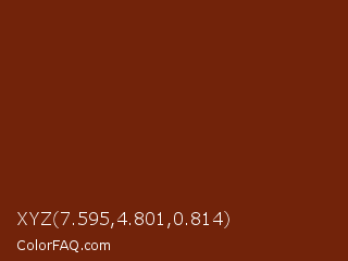 XYZ 7.595,4.801,0.814 Color is a dark red color and the nearest color is Moccaccino #6e1d14. Hex code #72230a and RGB value is rgb(114,35,10). In RGB color space, this color is composed of 45% red, 14% green, 4% blue, In CMYK color space, this color is composed of 0% cyan, 69% magenta, 91% yellow , 55% black , In HSL color space, this color has a hue angle of 14° , 84% saturation and 24% lightness.