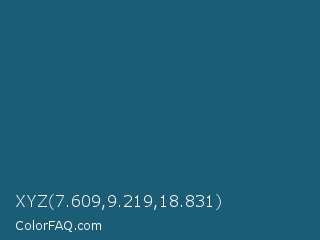 XYZ 7.609,9.219,18.831 Color is a dark blue color and the nearest color is Blumine #18587a. Hex code #1b5c77 and RGB value is rgb(27,92,119). In RGB color space, this color is composed of 11% red, 36% green, 47% blue, In CMYK color space, this color is composed of 77% cyan, 23% magenta, 0% yellow , 53% black , In HSL color space, this color has a hue angle of 198° , 63% saturation and 29% lightness.