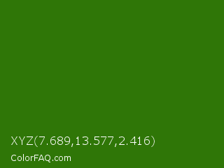 XYZ 7.689,13.577,2.416 Color is a dark green color and the nearest color is Napier Green #2a8000. Hex code #2f7607 and RGB value is rgb(47,118,7). In RGB color space, this color is composed of 18% red, 46% green, 3% blue, In CMYK color space, this color is composed of 60% cyan, 0% magenta, 94% yellow , 54% black , In HSL color space, this color has a hue angle of 98° , 89% saturation and 25% lightness.