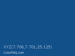 XYZ 7.706,7.701,25.125 Color is a normal blue color and the nearest color is Yale Blue #0f4d92. Hex code #12508a and RGB value is rgb(18,80,138). In RGB color space, this color is composed of 7% red, 31% green, 54% blue, In CMYK color space, this color is composed of 87% cyan, 42% magenta, 0% yellow , 46% black , In HSL color space, this color has a hue angle of 209° , 77% saturation and 31% lightness.