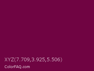 XYZ 7.709,3.925,5.506 Color is a dark magenta color and the nearest color is Pompadour #660045. Hex code #700442 and RGB value is rgb(112,4,66). In RGB color space, this color is composed of 44% red, 2% green, 26% blue, In CMYK color space, this color is composed of 0% cyan, 96% magenta, 41% yellow , 56% black , In HSL color space, this color has a hue angle of 326° , 93% saturation and 23% lightness.