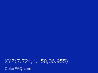 XYZ 7.724,4.158,36.955 Color is a normal blue color and the nearest color is International Klein Blue #002fa7. Hex code #0725a7 and RGB value is rgb(7,37,167). In RGB color space, this color is composed of 3% red, 15% green, 65% blue, In CMYK color space, this color is composed of 96% cyan, 78% magenta, 0% yellow , 35% black , In HSL color space, this color has a hue angle of 229° , 92% saturation and 34% lightness.